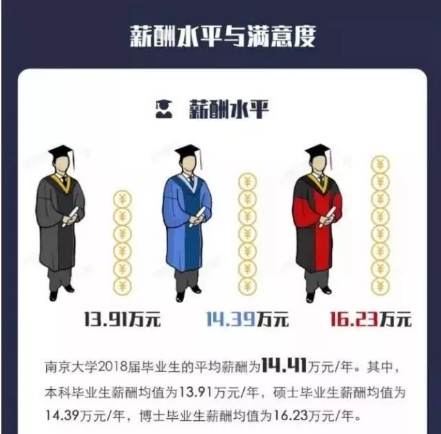 南京大学毕业生的平均薪酬也让不少其他院校的学子羡慕嫉妒恨。其中,本科生年薪高达13.91万/年,硕士高达14.39万/年,博士为16.23万/年。