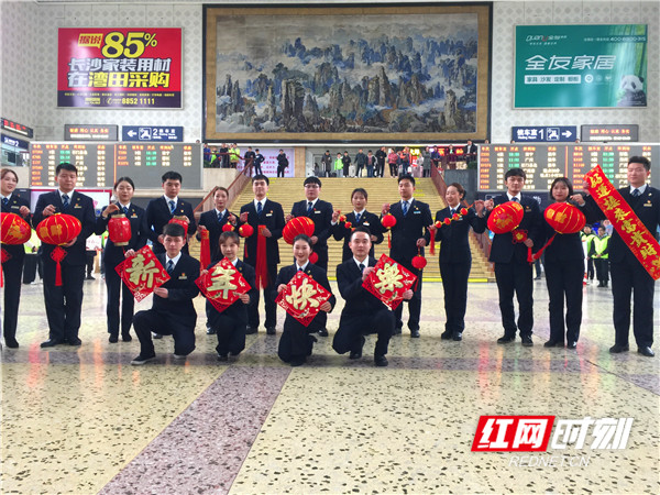 “长沙火车站祝大家旅途平安,新年快乐!”节目的最后,表演人员拿着灯笼、对联、中国结等饰品,来了一场充满年味的“制服秀”,并齐声为旅客送上祝福,让候车大厅充满了暖意。