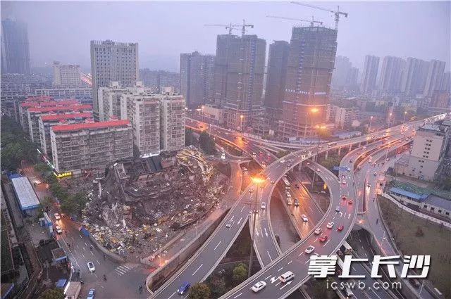 2018年3月24日中午11时36分,伴随着两台雾炮机和两台大型洒水车降尘开路,开福区维多利购物中心主体在挖掘机隆隆推进下顺利拆除倒地。