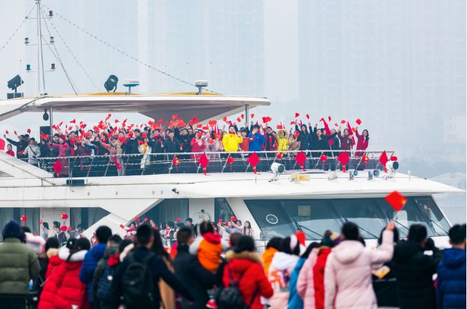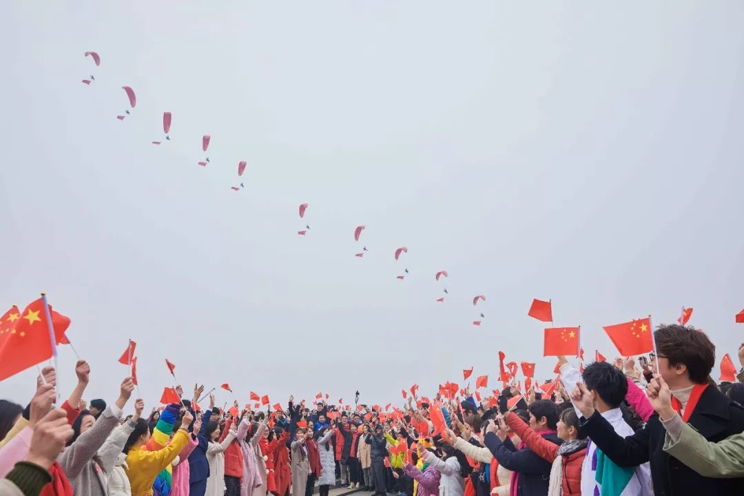 在歌曲高潮部分,十架动力伞从远空滑翔而来,挂上鲜艳的五星红旗。同时,一艘载客近千人的大游轮开足马力,驶向洲头。此时,船上、岸上、天上“水陆空”三处遥相呼应,瞬间引爆全场激情,万人挥舞国旗,高声同唱《我和我的祖国》,给祖国送上新春祝福。