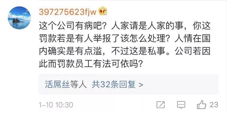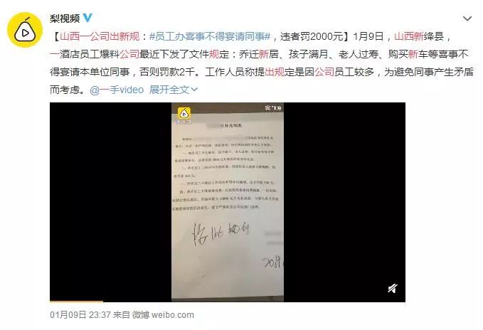 此前,山西一酒店员工曝光了公司的新规定:员工办喜事不得宴请本单位同事,否则罚款2000元。