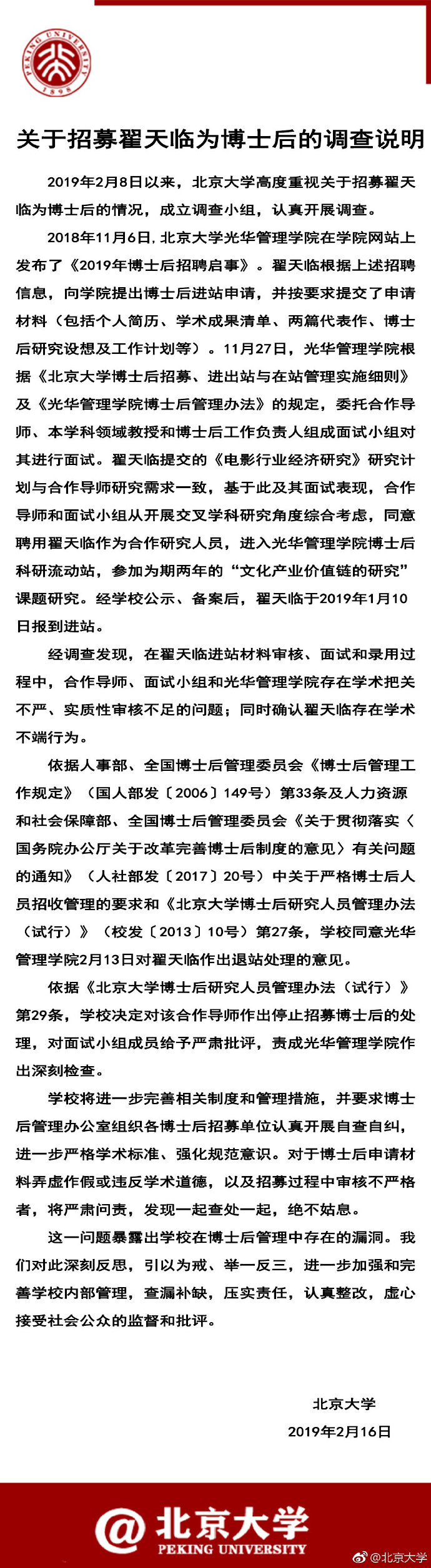 2月16日,北京大学官微发布关于招募翟天临为博士后的调查说明,说明称确认翟天临存在学术不端行为,对其退站处理。