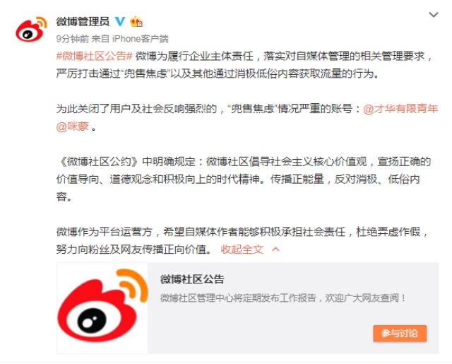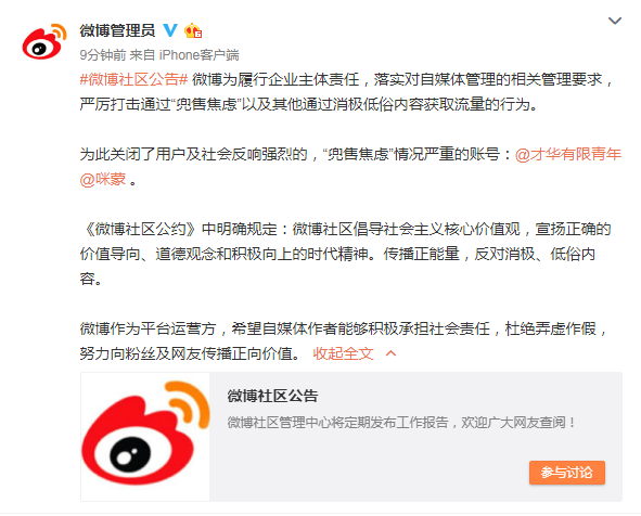 #微博社区公告# 微博为履行企业主体责任,落实对自媒体管理的相关管理要求,严厉打击通过“兜售焦虑”以及其他通过消极低俗内容获取流量的行为。