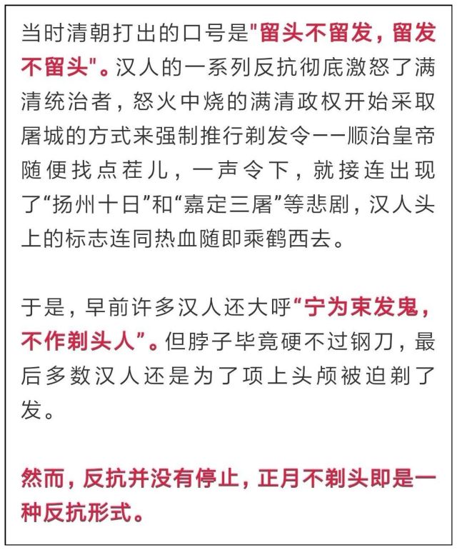近几年有很多科普文章提到,清军入关时候,为移风易俗,强令汉人剃发留辫,下达了一“剃发令”。为强硬执行,更是有“留发不留头,留头不留发”之说。