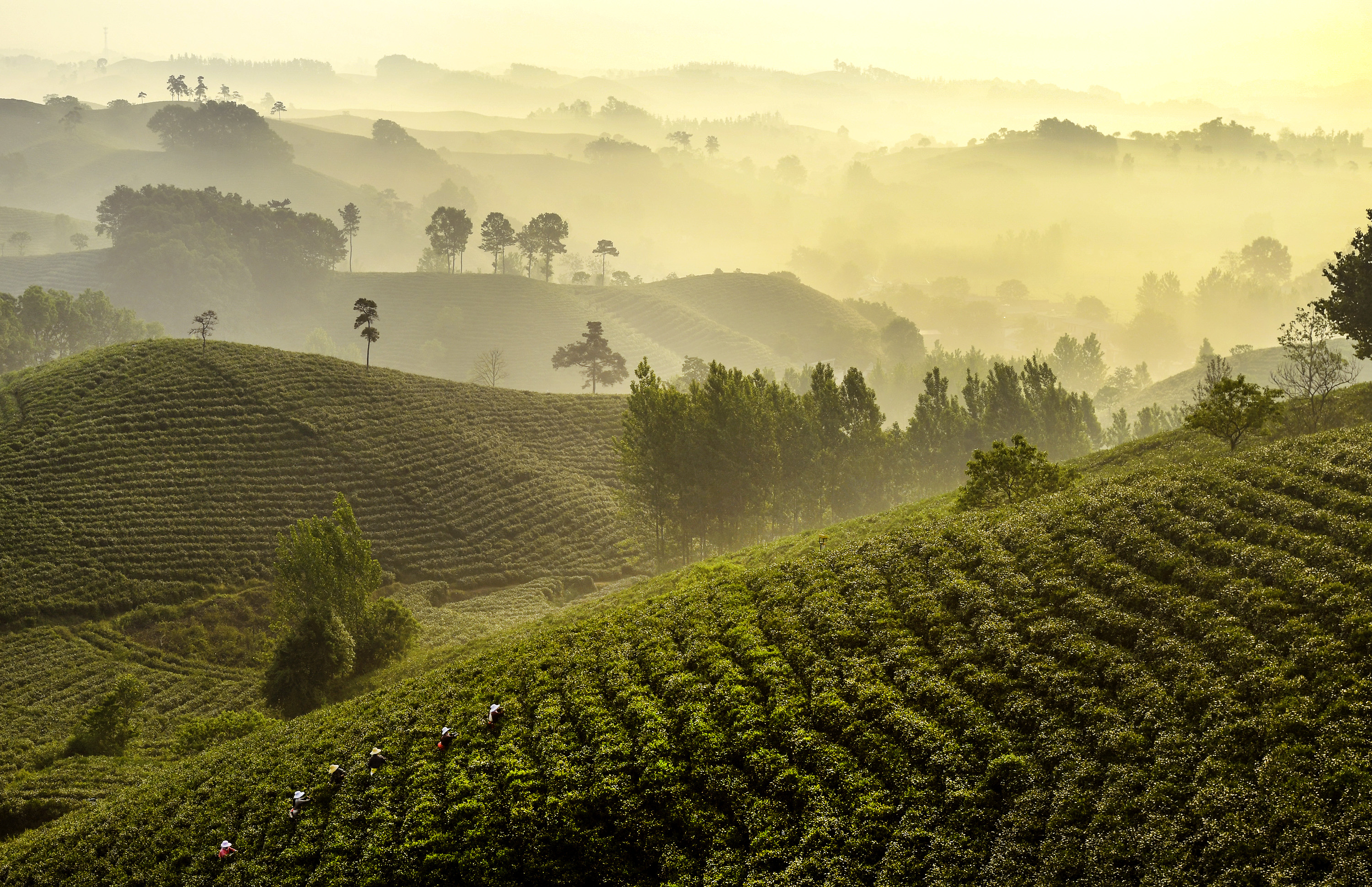 ↑茶农在河南省信阳市浉河区的生态观光茶园采摘茶叶(2018年4月28日摄)。新华社记者 陶明 摄