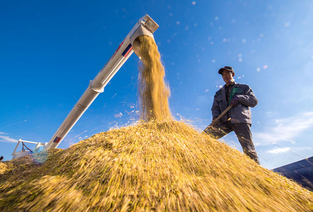 ↑在吉林省吉林市一拉溪镇,农民在运粮车上整理收割机收获的水稻(2018年9月17日摄)。新华社记者 许畅 摄