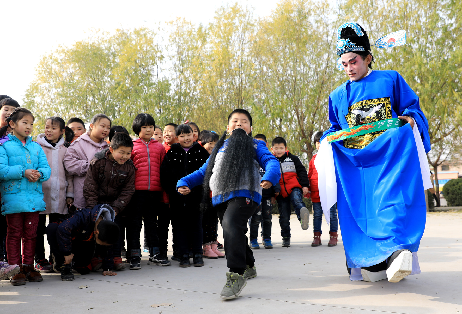 ↑在河北省晋州市李家庄小学,非遗“李家庄咳嗨腔”表演队队员与小朋友互动(2018年11月28日摄)。新华社记者 赵丹惠 摄