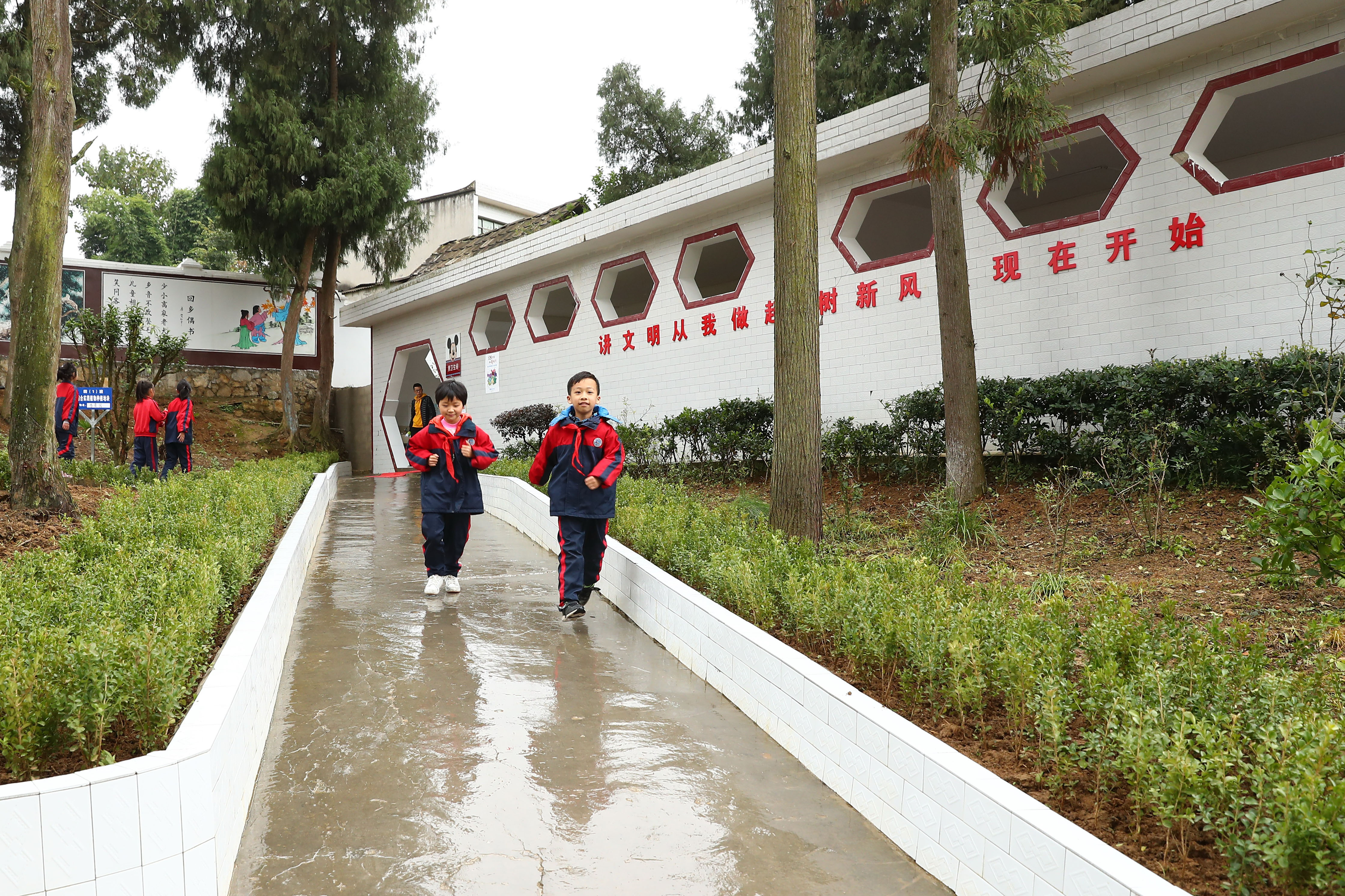 ↑贵州省织金县金龙小学的学生走过新建的冲水卫生厕所(2018年10月23日摄)。 新华社记者 张玉薇 摄