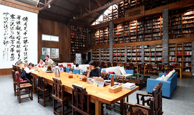 ↑这是浙江省德清县莫干山镇一家民宿的内景(2018年5月29日摄)。该民宿书香四溢,成为村里的一处文化空间。新华社记者 赖向东 摄