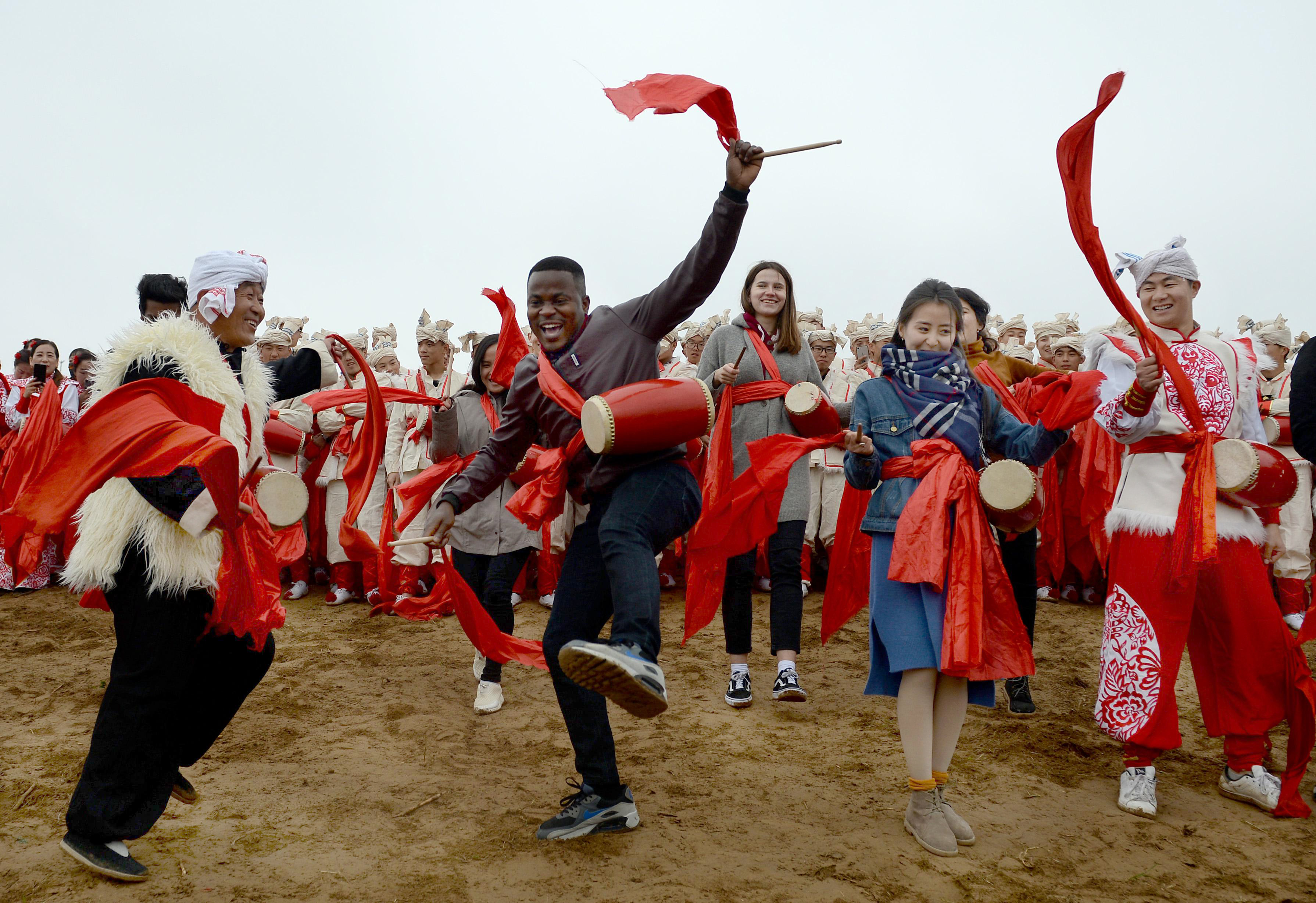↑在位于黄土高原腹地的陕西省延安市安塞区高桥镇南沟村,一场腰鼓演出结束后,外国留学生与当地腰鼓手一起打腰鼓(2018年10月20日摄)。新华社记者 刘潇 摄