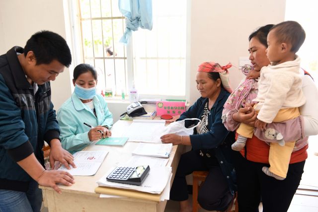 ↑在云南省澜沧拉祜族自治县酒井乡岩因村,村医张惠仙(左二)在村卫生室接待前来看病的村民(2018年11月28日摄)。 新华社记者 杨宗友 摄