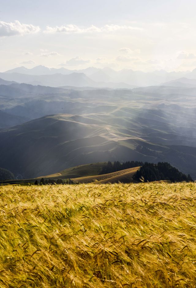 ↑在新疆木垒哈萨克自治县,成熟的小麦在夕阳照射下散发出迷人的金色(2018年8月26日摄)。新华社记者 赵戈 摄