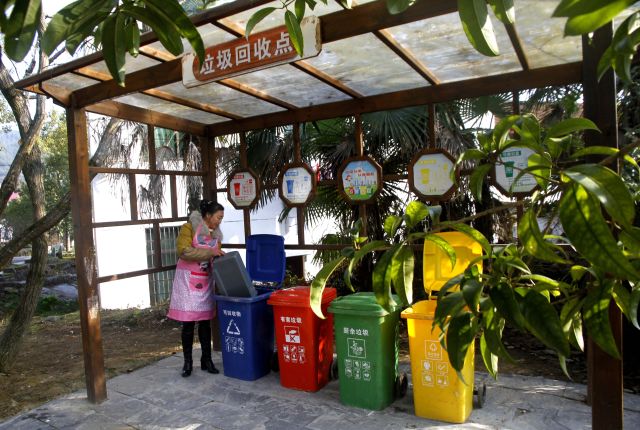 ↑村民在江西省靖安县高湖镇古楠村垃圾回收点分类倾倒垃圾(2019年1月23日摄)。新华社发(徐仲庭 摄)