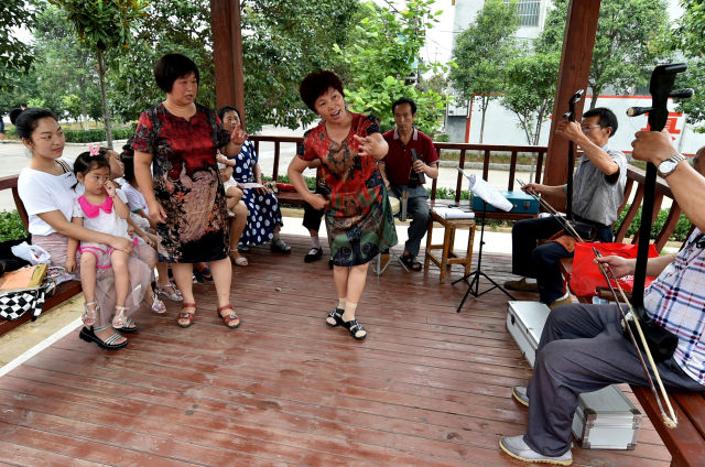 ↑河南省禹州市鸿畅镇李金寨村的村民在凉亭里唱戏(2018年6月26日摄)。新华社发(李嘉南 摄)