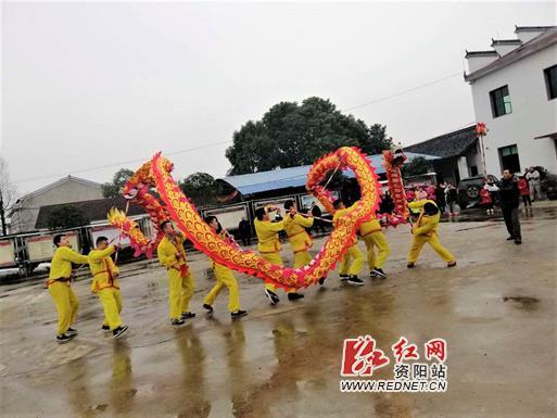 在新桥河镇向锋村,村民们正在欣赏“双龙戏珠”表演,金龙与红龙争相表现,多名舞龙表演者默契配合,头尾齐钻等经典动作千变万化、引人入胜。腰鼓队间歇的表演更是增添了节日喜庆氛围。着盛装的小丑和小旦们,为大家呈现的是一台台耳熟能详的地花鼓,村民们都围聚村民服务中心,