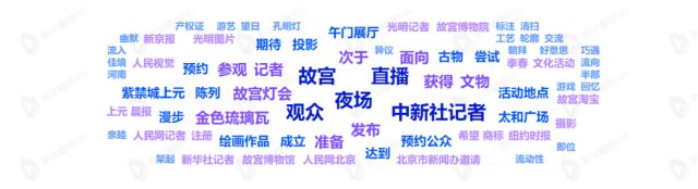 根据新华睿思大数据系统的“词云”显示,人们现在提及故宫时,很高频率地联想到“夜场、故宫灯会、上元、投影”这些词汇。可见,故宫上元“奇幻夜”给网民留下了深刻印象。