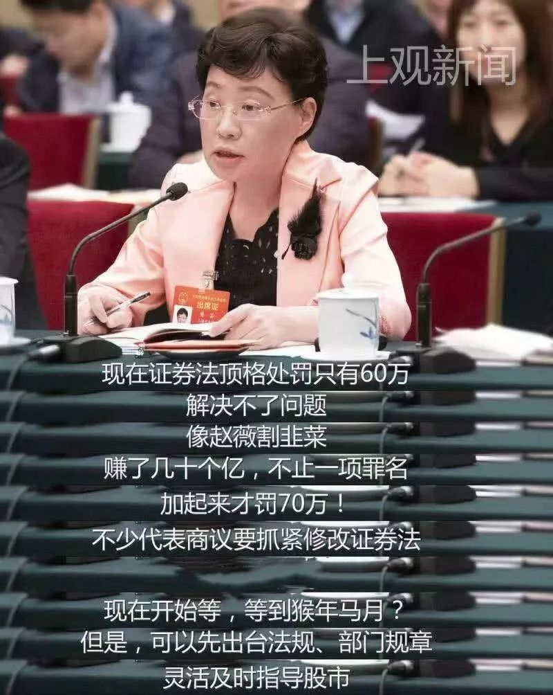 去年的全国两会上,全国人大代表、上海富申评估咨询集团董事长樊芸曾当着时任证监会主席刘士余的面,就股票退市制度、分红问题、对发审委委员的追责制等连续发问。会后,证监会曾专门邀请樊芸进一步探讨想法。