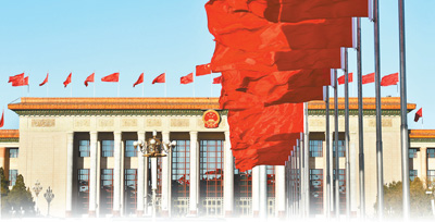 3月15日,人民大会堂外红旗招展。