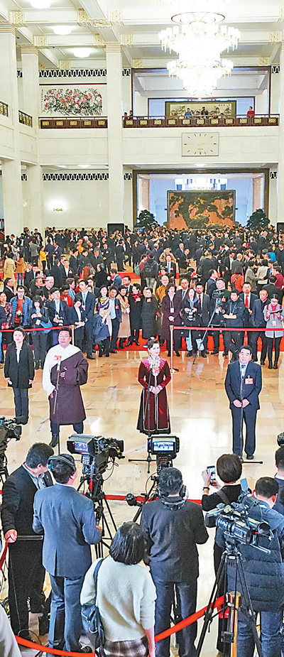3月9日,委员们在“委员通道”接受采访。