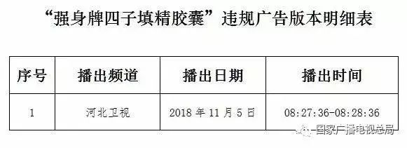 二、“力补金秋胶囊”和“强身牌四子填精胶囊”部分版本广告,含有宣传“益气固本、滋阴壮阳”、主治“阳痿不坚、遗精早泄”以及“补肾填精”等内容,存在违规播出提高性功能药品广告的问题。