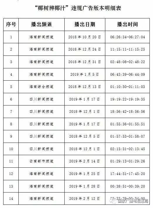 为严肃播出纪律,切实维护广大人民群众合法权益,根据相关法律法规规定,总局决定,自即日起,各级广播电视播出机构立即停止播出相关版本的“椰树牌椰汁”“力补金秋胶囊”和“强身牌四子填精胶囊”广告,并举一反三,全面清查所有在播和拟播广告,严把导向关,凡存在类似违规问题的,一律禁止播出,坚决杜绝此类违规问题。