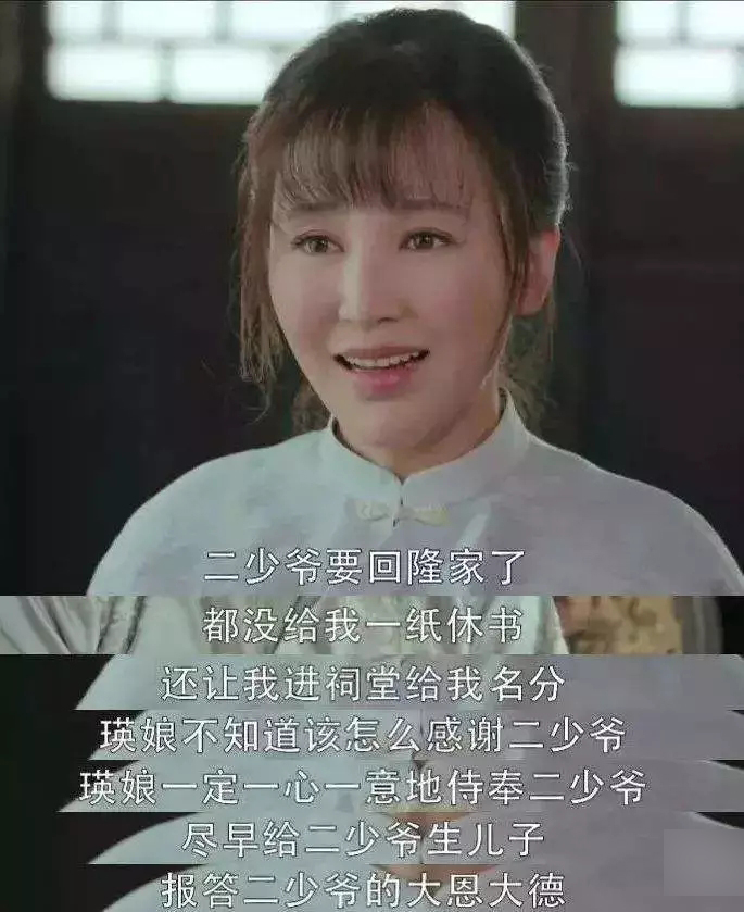 难产时,接生婆问到底是保大人还是保孩子,她更是声嘶力竭地说“我这条贱命算什么?我一定要为二少爷生出儿子!”并要求接生婆拿刀把自己肚子豁开,把孩子拿出来,别管她……“切腹宣言”让人恶寒,没想到第三个孩子又是女儿,瑛娘的悔恨和自责快要溢出屏幕。