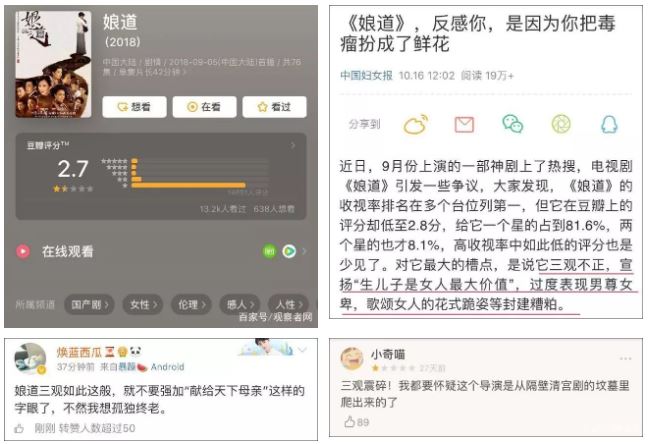 比如,近期国产电视剧《娘道》被广大网友斥为“封建糟粕的沉渣泛起”“升级版的女德”等,成为“性别歧视”“三观不正”的典型代表。