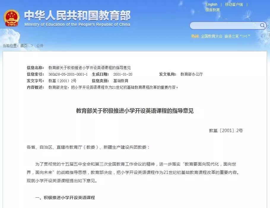 2001年,教育部发布关于积极推进小学开设英语课程的指导意见,决定把小学开设英语课程作为21世纪初基础教育课程改革的重要内容。