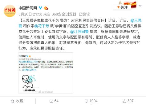 近日,@王思聪和作家 @花千芳就“学英语”的隔空互怼引发热议。随后王思聪还将头像换成花千芳,但却被 @江苏网警 点名,到底发生了什么?