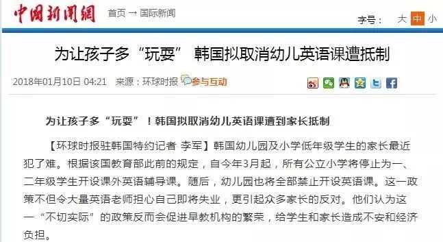 不仅仅是国内,这个难题在其他国家也出现过。2018年年初,韩国教育部决定自18年3月起,所有公立小学将停止为一、二年级学生开设课外英语辅导课,幼儿园也将全部禁止开设英语课,但遭到家长们的强烈反对。