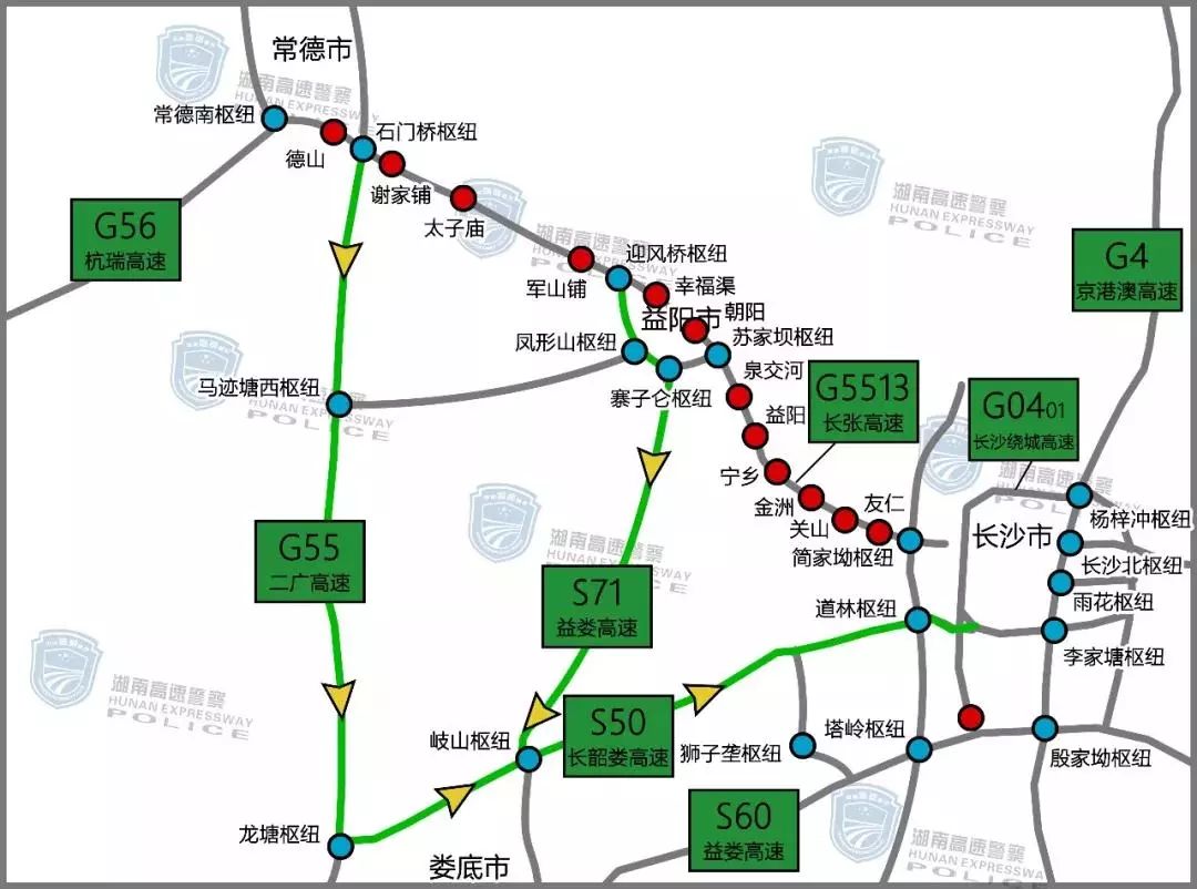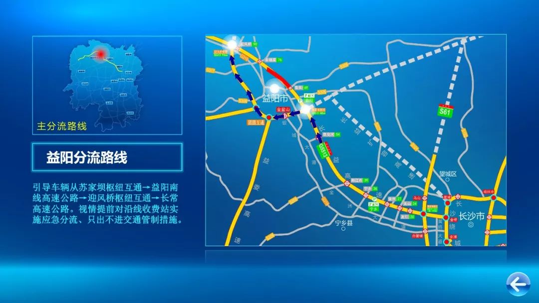 高警局益阳支队对迎风桥、幸福渠、朝阳、泉交河、益阳(湘江西)收费站实施只出不进交通管制措施,根据主干交通流量状况,在长常高速公路迎风桥枢纽互通、寨子仑枢纽互通、金盆山收费站互通执行交通管制任务,引导西往东方向车辆经迎风桥枢纽互通→益阳绕城高速→金盆山收费站互通→银城大道→金洲大道通行,(见图四)或经迎风桥枢纽互通→益阳绕城高速→寨子仑枢纽互通→益娄高速公路→岐山枢纽互通→长韶娄高速→长沙绕城高速通行。(见视频二)