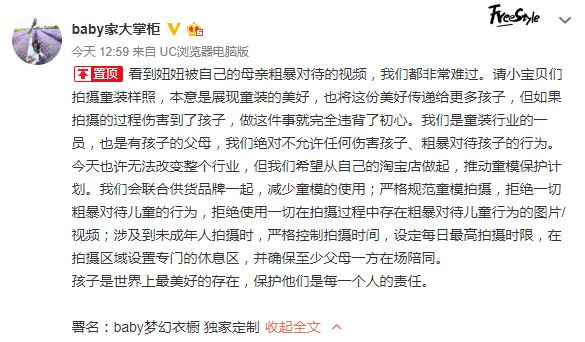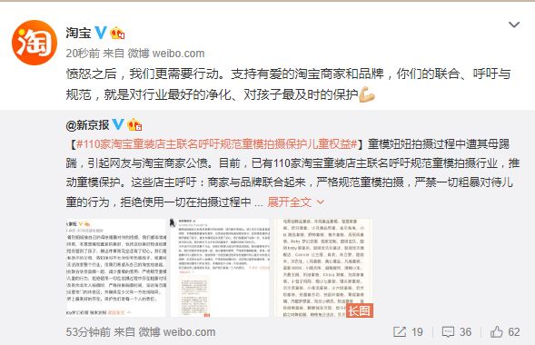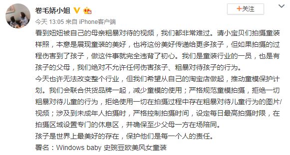 9日下午有些网店店主发表声明,目前已有100多家淘宝童装店主联名呼吁规范童模拍摄行业,推动童模保护。这些店主呼吁:商家与品牌联合起来,严格规范童模拍摄,严禁一切粗暴对待儿童的行为,拒绝使用一切在拍摄过程中存在损害儿童权益行为的图片/视频。