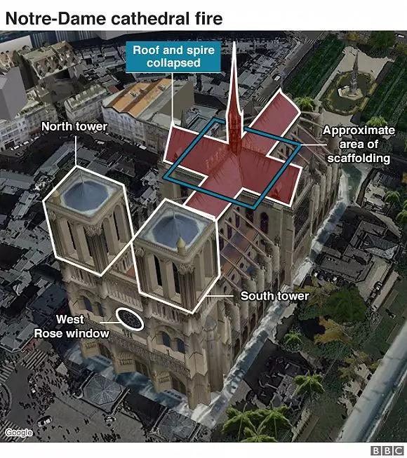 英国BBC解析这次巴黎圣母院起火位置(图源:BBC)