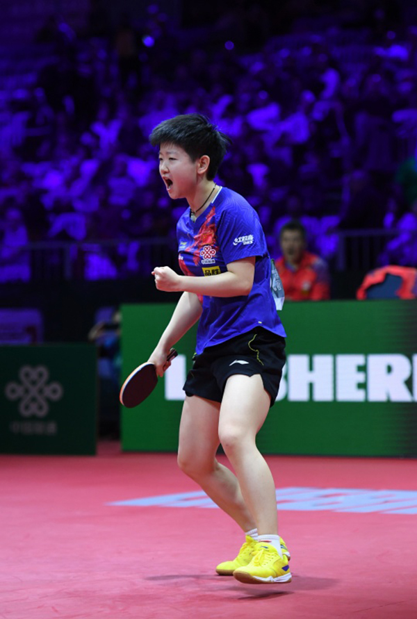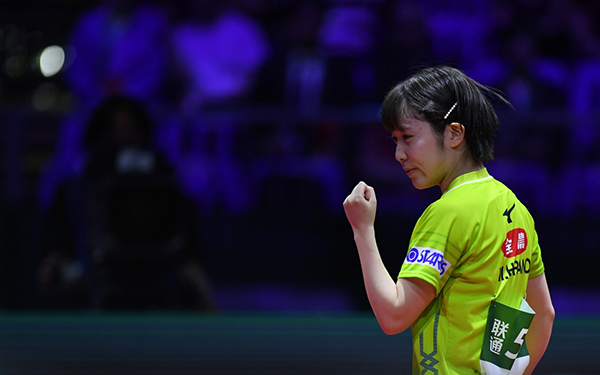 平野美宇庆祝得分。