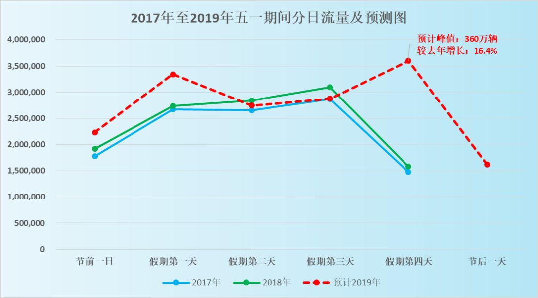 五一长假高速车流峰值日出现在 5 月 4 日,预计峰值流量 360 万辆,峰值同比增长 16.4%,约为日常流量的 2 倍。