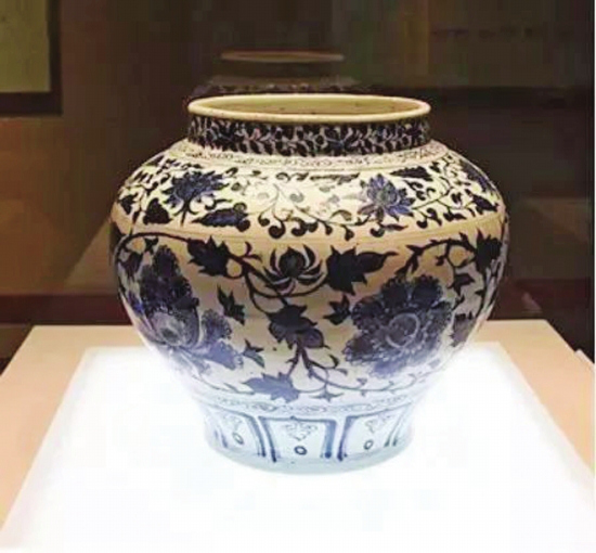 湘潭博物馆的镇馆之宝,是一个元代的青花。1988 年,马家河派出所打掉一个文物贩卖团伙,缴获了一批藏品,这件元末缠枝牡丹纹青花瓷罐就是其中一件。一个元代青花被奉为镇馆之宝,实在是因为元代青花过于珍贵,据统计,目前全世界元代青花加起来不足 400 件。
