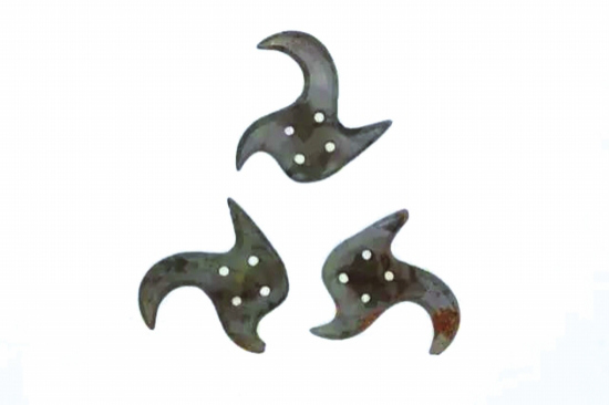 在博物馆里,我们常常能见到刀剑之类的青铜兵器,但是,青铜 " 飞镖 " 你见过吗?2007 年 10 月,常德博物馆的考古工作者在德山一家楚墓中发现了三件异形青铜兵器——飞镖,这三件异形青铜兵器尺寸相同,基本保存完好,每件重约 21 克,呈平面形,有三个略呈弧形的尖刃,周身均有刃口,中部有四个对称分布的圆孔,整个器形的流线型非常适当,特别适合在空气中飞行。德山出土的这三枚青铜飞镖,系国内首次发现,堪称国宝。