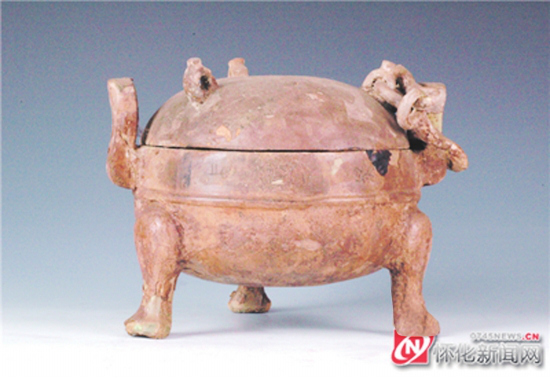 怀化市博物馆镇馆之宝 " 中脯王鼎 ",因其口沿下外壁刻有 " 中脯王鼎 " 铭文而得名,1978 年于溆浦县马田坪 M24 秦墓中出土。" 中脯王鼎 " 外观顶部带盖,内敛子母口,圆腹圜底,矮蹄足,方形附耳一对,耳上端略为外撇,盖隆起,上置三环状钮,钮与耳内铜链。伴随 " 中脯王鼎 " 出土的铜矛上刻有秦官名 " 少府 " 两字,而其出土的墓葬封土厚达 3 米多,上面还覆盖着三家大墓,这就说明墓葬规格相对较高,由此推测是秦代将领在征战中埋葬在楚地,也可以推测,曾经秦人与楚人在此发生过激烈的战争。