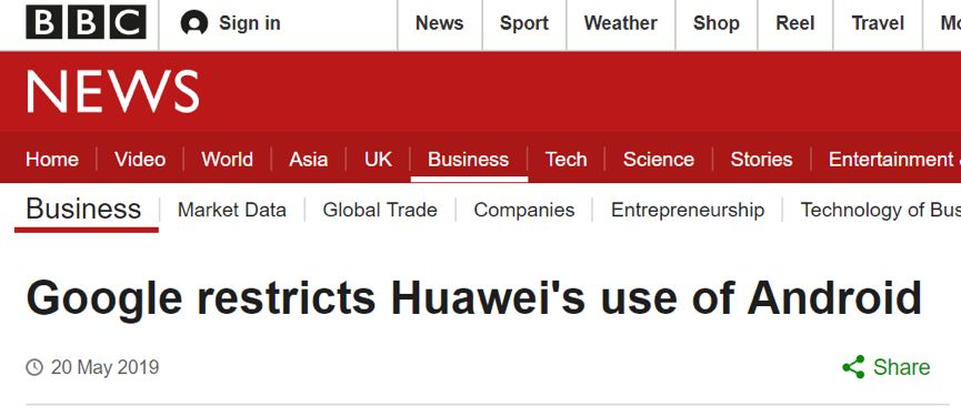 今天凌晨,英国路透社传来一条对华为公司开拓海外市场很不利的消息:受美国政府绞杀华为的禁令影响,美国谷歌公司已中止与华为的部分业务。
