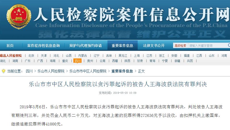 人民网成都5月21日电(任重)据人民检察院信息公开网消息,近日,乐山市市中区人民检察院以贪污罪起诉的被告人王海波获法院有罪判决,判处被告人王海波有期徒刑三年,并处罚金人民币二十万元,对王海波上缴的犯罪所得272636元予以没收,由扣押机关上缴国库,继续追缴犯罪所得41000元。