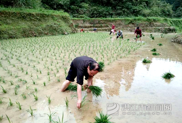 群峰乡兰家溪组易延学、杨友和为建档立卡贫困户,两位老人年老多病,均无劳动能力,儿子儿媳又常年外出务工,家庭生活困难。得知易延学家缺人手插秧,为帮助他家及时抓好春耕生产,蛇形村扶贫工作队蒋良文、市人武部驻村工作队员向同华等人来到易延学家的田地,纷纷卷起裤腿,手拿秧苗,动作娴熟地进行插秧栽种,大家齐心协力,终于帮助易延学家栽插完成4亩水田。