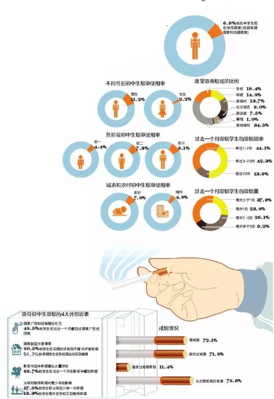 《2014中国青少年烟草调查报告》显示,初中生现在吸烟率为6.4%,也就是每百名初中生中有6人是烟民。在吸烟的初中生中,有三成已存在烟草依赖。