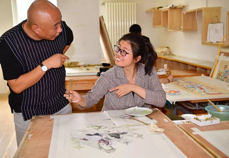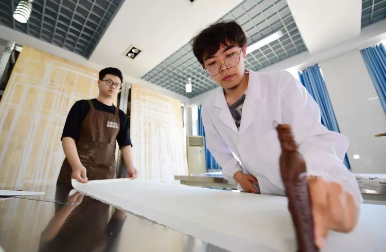在洛阳市文物考古研究院,西北大学文物保护技术专业学生刘德超(右)在字画修复师范名远的指导下学习书画装裱技术。