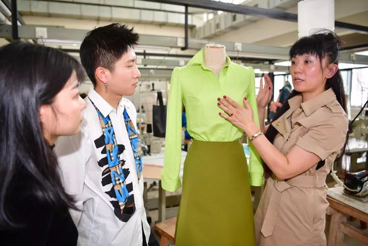 西安美术学院服装与服饰设计系主任陈霞(右一)在向学生讲解一件毕业设计作品的剪裁。
