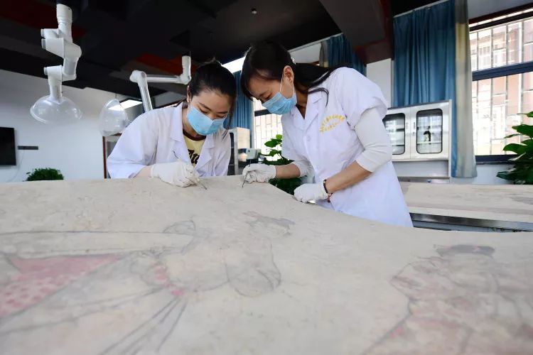 在洛阳市文物考古研究院,西北大学文物保护技术专业学生田丹玉(左)和壁画修复师田玉娥清理一件唐代壁画。