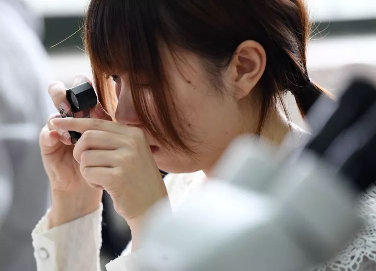 在长安大学珠宝鉴定实验室,地质学专业宝玉石学与珠宝鉴定方向的学生正在观测一枚红宝石。