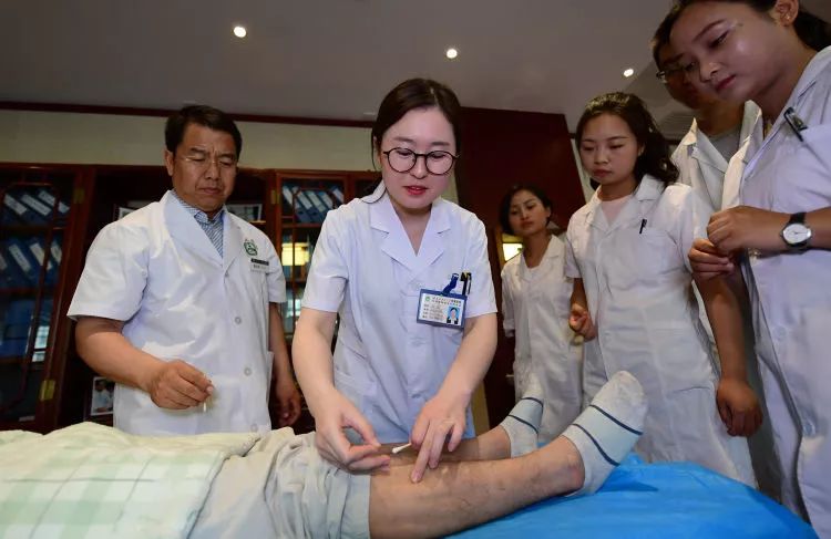 在陕西中医药大学附属医院名医馆,针灸推拿学专业学生王娟(左二)在教授雷正权的指导下练习针刺。