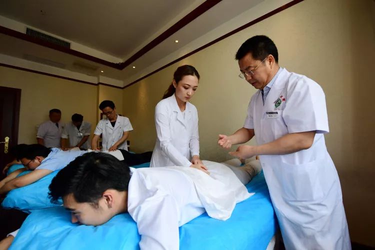 在陕西中医药大学附属医院名医馆,针灸推拿学专业哈萨克斯坦留学生韩笑(右二)在教授雷正权(右一)的指导下学习推拿手法。