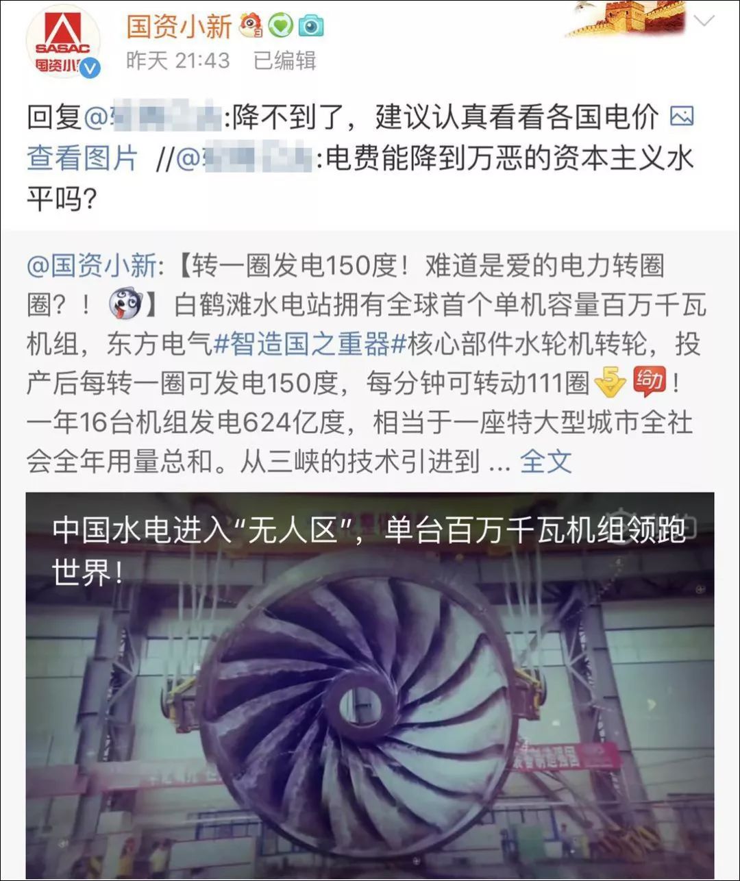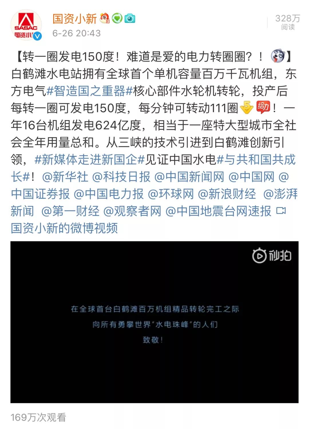 6月26日晚,国务院国资委新闻中心官方微博@国资小新 发了一条题为“转一圈发电150度!难道是爱的电力转圈圈?!”的微博,说的是白鹤滩水电站拥有全球首个单机容量百万千瓦机组,东方电气核心部件水轮机转轮,投产后每转一圈可发电150度,每分钟可转动111圈,一年16台机组发电624亿度,相当于一座特大型城市全社会全年用量总和。