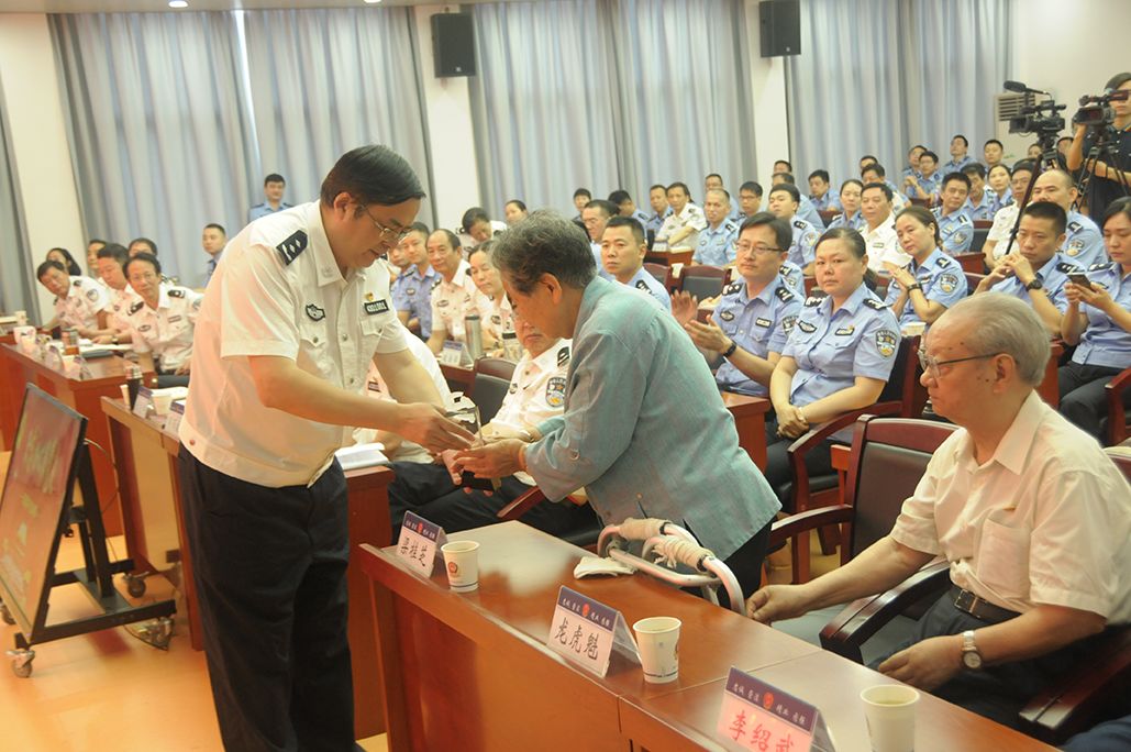 钟艺兵为党龄超过60年的离退休老同志颁发“光荣在党60年”纪念杯。